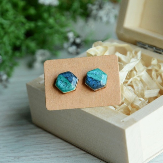 Jak ocean to kolczyki typu sztyft w kształcie sześciokąta, ręcznie malowane na drewnie (sklejka). Wzór został pokryty pełną blasku żywicą. Sztyfty i zapięcia są srebrne. W komplecie otrzymasz eleganckie pudełeczko. Dostępnych jest kilka podobnych par.