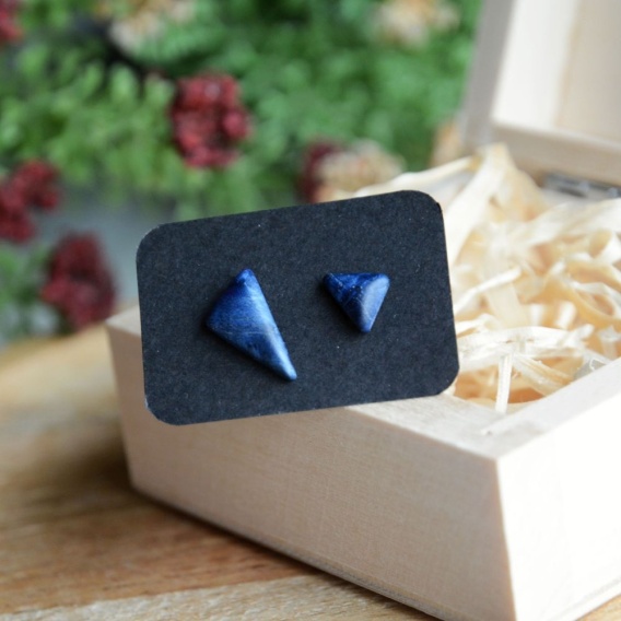 Ręcznie wykonane kolczyki na sztyfcie w kształcie granatowych trójkątów.