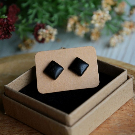 Kwadratowe kolczyki wykonane zostały ręcznie z kawałeczków czarnego drewna i srebra. Są starannie wykończone, delikatne i gładkie w dotyku.