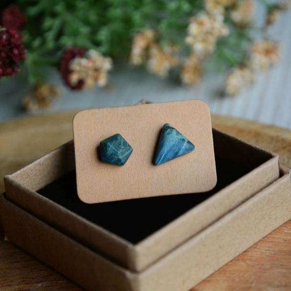 Ręcznie wykonane kolczyki nie do pary - niebieski trójkąt i sześciokąt.