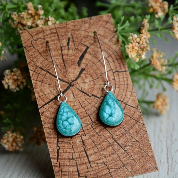 Długie kolczyki wiszące z turkusowym oczkiem w kształcie łezki. Ręcznie malowane na drewnie. Wzór pokryty błyszczącą żywicą.