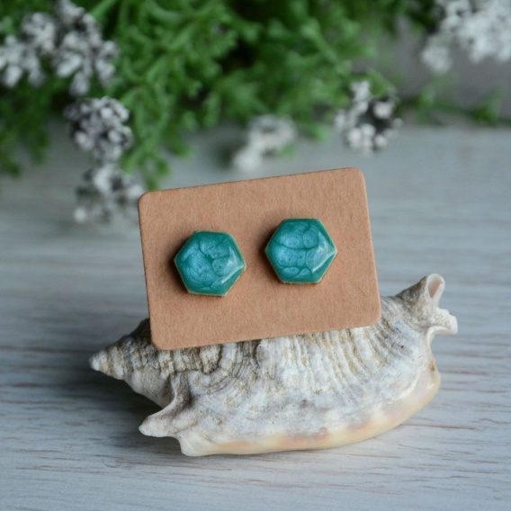 Turkusowe kolczyki typu sztyft w kształcie sześciokąta, ręcznie malowane na drewnie (sklejka). Wzór został pokryty pełną blasku żywicą. Sztyfty i zapięcia są srebrne. W komplecie otrzymasz eleganckie pudełeczko. Dostępnych jest kilka podobnych par.