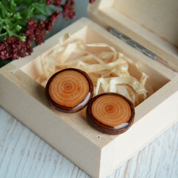 Duże spinki do mankietów wykonane z drewna z pociętej na plastry gałęzi. Oczka pokryte są żywicą o wysokim połysku. Baza spinek wykonana jest z dobrej jakości posrebrzanego mosiądzu. Natura i elegancja w jednym.
