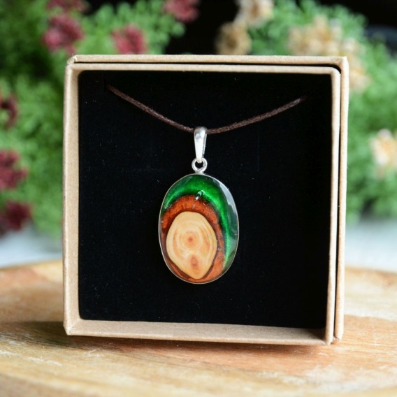 Duży owalny wisior z plastra drewna i żywicy w srebrnej oprawie wykonany został ręcznie. Ciekawa kompozycja w odcieniach brązu i zieleni. Wykończenie na wysoki połysk. Dostępny jest tylko jeden egzemplarz.