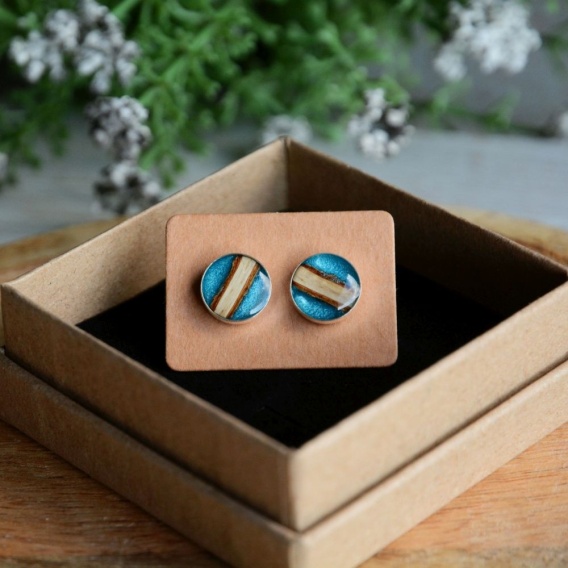 Wyjątkowe kolczyki stworzone z drewna, żywicy i srebra.