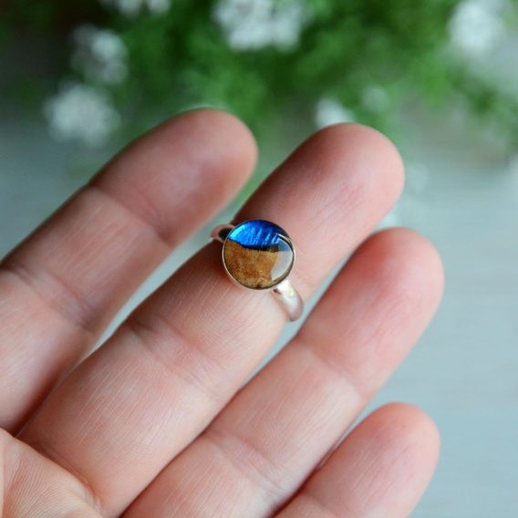 Pierścionek z drewna i niebieskiej żywicy to jeden z moich ulubionych wyrobów. Do jego zrobienia wykorzystałam kawałek drewna oraz barwioną żywicę. Okrągłe oczko zostało oprawione w srebro, pokryte żywicą, a następnie wypolerowane na wysoki połysk.