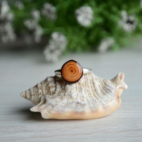 Regulowany, srebrny pierścionek (próby 925) z drewnianym oczkiem, pokrytym żywicą, aby pięknie błyszczał na palcu i w słońcu. Szlifowany ręcznie, chociaż wzór to już sama Natura zrobiła. Każdy jest wyjątkowy i trochę inny, bo różnie układają się słoje w gałązkach i dwóch identycznych się nie znajdzie, ale ludzie też są różni.
