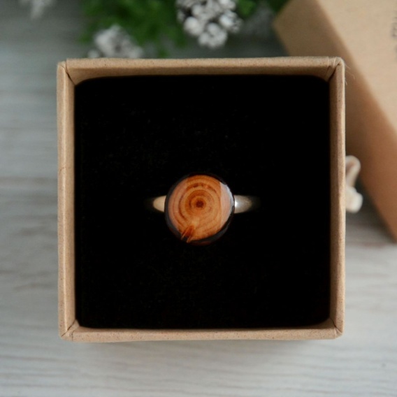 Pierścionek z drewnianym oczkiem z modrzewia i srebra. Oczko o średnicy 12 mm zrobione zostało z gałęzi pociętej na plastry, następnie oszlifowane i zabezpieczone błyszczącą żywicą, która pięknie podkreśla słoje. Obrączka wykonana jest ze srebra. Posiada regulowany rozmiar, przy czym jej minimalna średnica to 17 mm. Dostępna tylko jedna sztuka. Być może czeka właśnie na Ciebie? :)