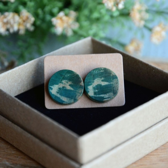 Okrągłe ciemnozielone kolczyki wkrętki z barwionego drewna | ręcznie wykonane | srebro 925