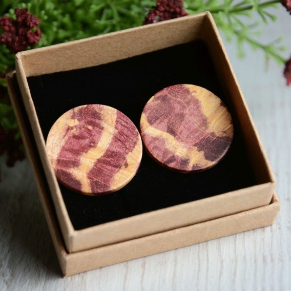 Fioletowe, wpadające w róż kolczyki XXL wykonane zostały z barwionego drewna. Posiadają wyrazistą barwę i ciekawy wzór. Kolczyki są bardzo duże, a jednocześnie lekkie. Pozwalają wyróżnić się w tłumie. Dostępna jest tylko jedna para.