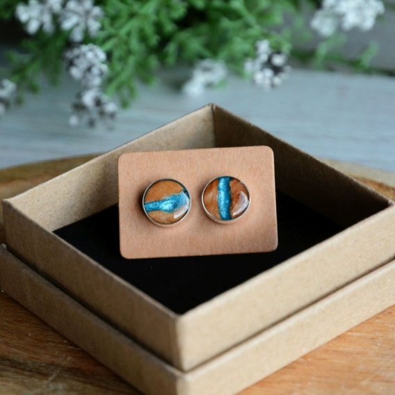 Te wyjątkowe kolczyki powstały z drewna i żywicy. Do ich zrobienia wykorzystałam piękny kawałek jasnego drewna oraz żywicy. Żywica została zabarwiona na niebiesko i zawiera mieniące się drobinki. Całość oprawiona w srebro próby 925. W komplecie wygodne srebrne zapięcia. Dostępna para ze zdjęć.