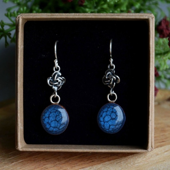 Kolczyki wiszące ze srebrną różą i z granatowym oczkiem.