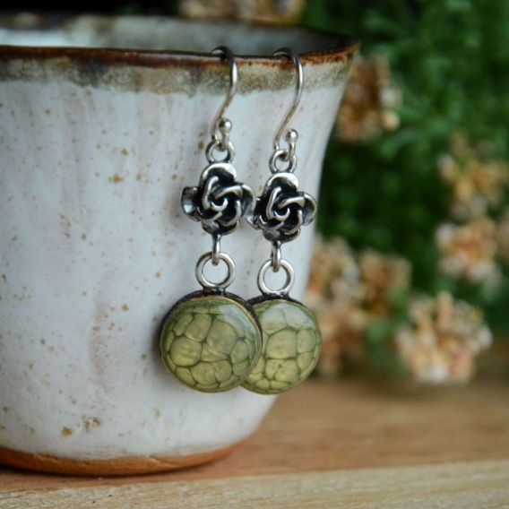 Unikatowe kolczyki handmade. Oczka w kolorze zielonym są ręcznie malowane na drewnie i pokryte błyszczącą żywicą. Element ozdobny w postaci róży wykonany jest z oksydowanego srebra.