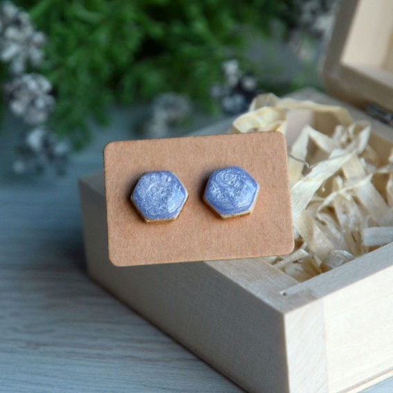 Liliowe kolczyki typu sztyft w kształcie sześciokąta, ręcznie malowane na drewnie (sklejka). Wzór został pokryty pełną blasku żywicą. Sztyfty i zapięcia są srebrne. W komplecie otrzymasz eleganckie pudełeczko. Dostępnych jest kilka podobnych par.