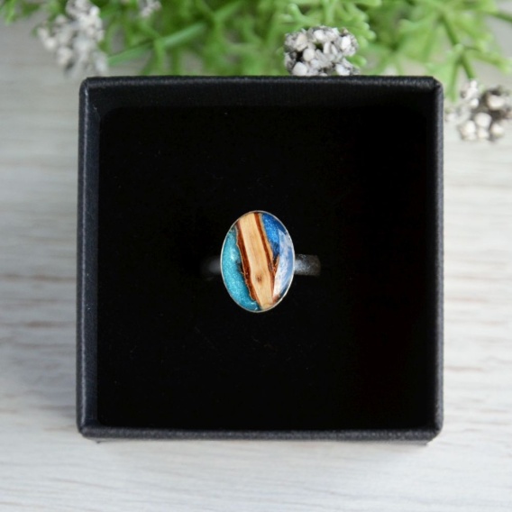 Niebieski pierścionek z oczkiem z drewna i żywicy to jeden z moich ulubionych wzorów. Do jego zrobienia wykorzystałam kawałek gałązki oraz zabarwioną w dwóch odcieniach niebieskiego żywicę. Owalne oczko zostało oprawione w srebro i wypolerowane na wysoki połysk. Unikat. Dostępny jest jeden egzemplarz ze zdjęć.