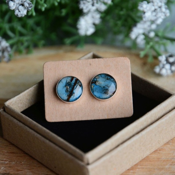 Wyjątkowe kolczyki (piszę wyjątkowe, ponieważ nie da się stworzyć drugich takich samych), powstały z naturalnej kory brzozy i niebieskiej żywicy. Całość oprawiona jest w srebro próby 925. W komplecie wygodne srebrne zapięcia. Dostępna jest tylko jedna para. Być może czeka właśnie na Ciebie?
