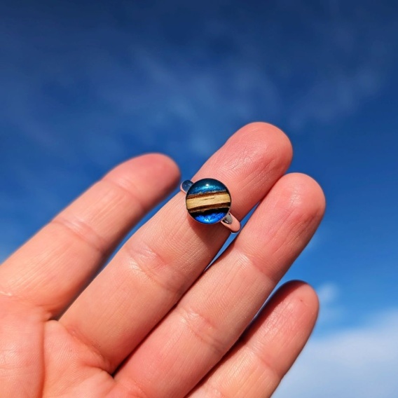 Pierścionek z drewna i żywicy to jedn z moich ulubionych wyrobów. Do jego zrobienia wykorzystałam kawałek delikatnej gałązki oraz żywicę barwioną w odcieniach niebieskiego. Okrągłe oczko zostało oprawione w srebro, pokryte żywicą i wypolerowane na wysoki połysk. Dostępny jest tylko jeden egzemplarz. Być może czeka właśnie na Ciebie?