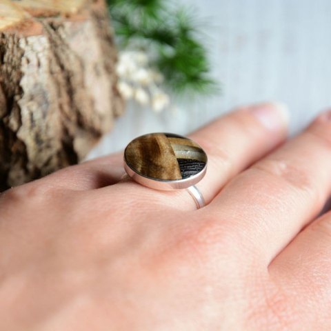 Ten pierścionek wykonany został z ręcznie skomponowanej mozaiki z drewna z kawałkiem żywicy. Duże, okrągłe oczko zostało oprawione w srebro próby 925, starannie oszlifowane (łączenie jest niewyczuwalne), a następnie wypolerowane. Dostępny jest tylko jeden egzemplarz.