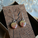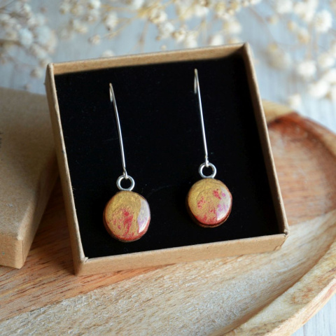 Długie kolczyki wiszące w ciepłych kolorach powstały z plastrów drewna i srebra. Połączyłam tutaj kolor żółty z dodatkiem czerwieni. Wzór został namalowany ręcznie i pokryty błyszczącą żywicą. Dostępna jest jedna para.