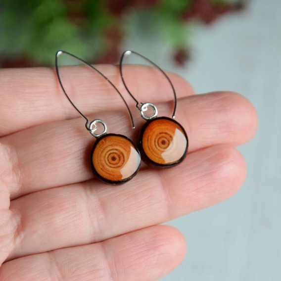 Długie kolczyki wiszące z oczkiem z drewna wykonane z plastrów modrzewia oraz srebra. Oczka kolczyków pokryte są błyszczącą żywicą, co dodaje mi elegancji i podkreśla słoje.