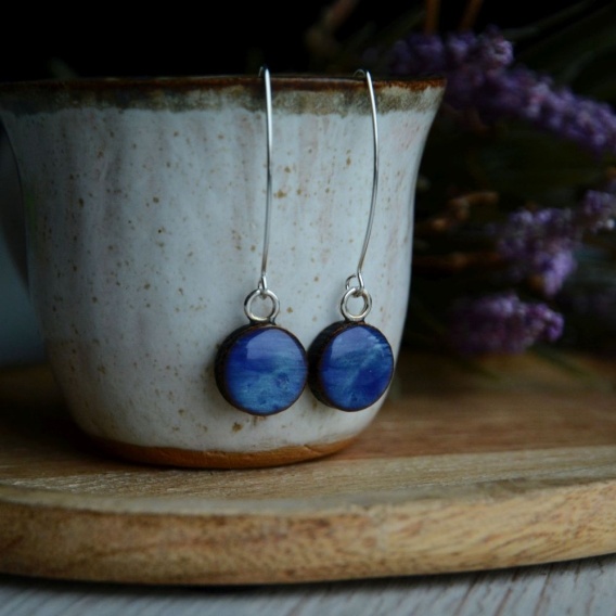 Długie, wiszące kolczyki wykonane ręcznie z drewna i srebra. Każda para jest ręcznie malowana w odcieniach niebieskiego, a następnie zabezpieczona warstwą żywicy, która podkreśla kolor.