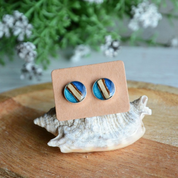 Drewniane kolczyki wykonane ręcznie z drewna z niebieską żywicą. Ciekawy wzór inspirowany jest nadmorskim krajobrazem. Całość oprawiona została w srebro próby 925. W komplecie wygodne srebrne zapięcia. Dostępna jedna para.