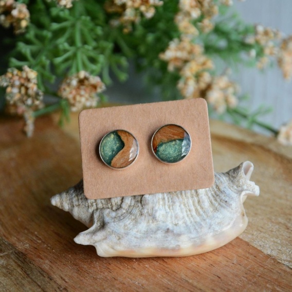 Wyjątkowe kolczyki zrobione ręcznie z drewna i żywicy w srebrnej oprawie.