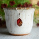 Mała owalna zawieszka z czerwienią w srebrze. Do jej zrobienia wykorzystałam kawałek kory oraz zabarwioną na czerwono żywicę z mieniącymi się drobinkami. Owalne oczko zostało oprawione w srebro i wypolerowane na wysoki połysk. Dostępne są 3 podobne wisiorki.