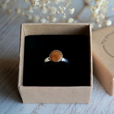Pierścionek z bukowym oczkiem w srebrnej oprawie wykonany został z naturalnego plastra drewna o promienistym wzorze. Niewielkie oczko o średnicy 9 mm oprawione jest w srebro i pokryte błyszczącą żywicą, która pięknie podkreśla naturalny rysunek drewna i dodaje elegancji. Obrączka wykonana jest ze srebra. Posiada regulowany rozmiar - można ją samodzielnie powiększyć i dostosować do palca. Minimalna średnica pierścionka to 16 mm. Dostępny jest tylko jeden egzemplarz.